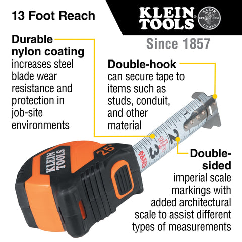 Klein Tool's Lightweight Tape Measure offers a best in-class compact design with up to 13 feet of reach and delivers a product that is easy to carry around all day and store in tight areas to make jobs easier and more efficient. A finger brake controls the blade retraction speed for extra hand protection and a safer retraction. The durable nylon coating protects the layout markings and prevents the tape blade from rust and degradation. The high impact rugged, compact design stands up to basic demands of any jobsite.