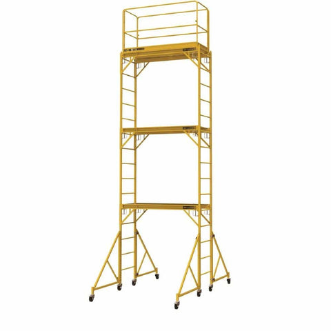 - Includes: 3 ft. to 6 ft. scaffolding frames, 3 plywood platforms, 12 caster wheels, 1 guardrail set, 1 set of 4 outriggers