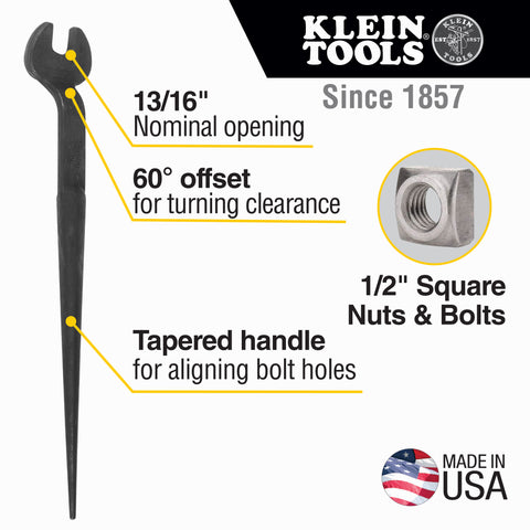 Forged from select alloy steel, the Klein Tools 13/16-Inch Nominal Opening Spud Wrench is designed to withstand high-leverage and heavy loads. It's designed for use with 1/2-Inch bolts and U.S. regular nut types. The extra-duty head area gives maximum strength and durability. Plus, the continuous taper of the handle makes it easy to line up bolt holes.