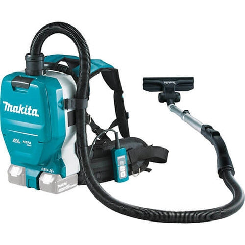 The Makita 18V X2 LXT Lithium-Ion (36V) Brushless cordless 1/2 Gallon HEPA filter backpack dry vacuum (tool only, batteries and charger sold separately) is a powerful and portable clean-up solution that eliminates extension cords that trail corded backpack vacuums. It's also a powerful and portable dust extraction solution for contractors by bridging the gap between low-capacity on-board dust extraction systems and larger capacity but less portable wheeled canister job site vacuums. The backpack dry vacuum kit is ideal for cleaning crews, as well as for construction applications when used as part of a dust extraction system. The backpack dry vacuum is powered by two 18V Lithium-Ion batteries (sold separately) for 36V power and performance but without leaving the 18V LXT battery platform. The efficient BL Brushless Motor generates 70 CFM of suction and 44 In. of static water lift for fast clean-ups and improved dust extraction, with no cord to pull along or get in the way. The backpack dry vacuum weighs only 9.9 lbs. (with empty dust bag and two 18V 5.0 Ah batteries, batteries sold separately) and has padded shoulder straps and waist belt with multiple adjustments for a comfortable fit. Cordless and compact, the push button power selection controller attaches to the waist belt of the harness for convenient operation, and the 39 In. flexible hose has a telescoping extension wand with 20 In. 1/2 34 In. of additional reach. The efficient HEPA filter captures 99.97% of particulates 0.3 microns and larger extending the life of the main filter, and the half-gallon dust collection container is easily removed for dust disposal. When using two 18V 5.0 Ah batteries, users will get up to 116 minutes at normal setting and 33 minutes at max setting of continuous operation.