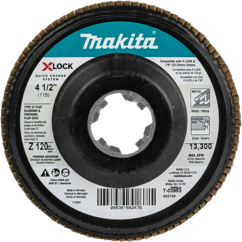 (1) Makita T-03953 X-LOCK 4?1/2in. 120 Grit Type 27 Flat Blending and Finishing Flap Disc for X-LOCK and All 7/8in. Arbor Grinders