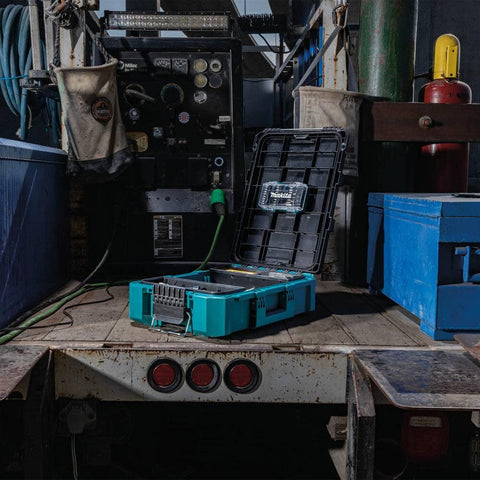 Makita MAKTRAK is the Next Generation in modular storage. The MAKTRAK Medium Tool Box (T-90037) is a modular storage solution to transport, access, store and organize job site equipment and tools. It has a holding capacity of 1,123 cu.in. and up to 75 lbs. Its equipped with large glove-friendly latches for easy access to tools, accessories, batteries, chargers and small parts.