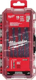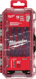 The MILWAUKEE THUNDERBOLT 15PC Black Oxide Drill Bit Set offers heavy-duty performance on the jobsite. Black Oxide coating reduces heat build-up and provides corrosion resistance. The thicker core provides ultimate strength and protects against side-load breakage while a specially designed parabolic flute form clears chips and debris fast to keep the bit cool. The 135 deg split point tip delivers a precision start and prevents walking for fast, accurate holes. MILWAUKEE THUNDERBOLT Black Oxide Coated bits are ideal for various drilling applications in wood, plastics, and metals. The set is organized in a customizable accessory case designed for use in PACKOUT.