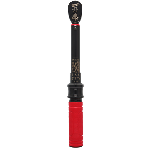 The Milwaukee® 1/4” Drive Click Torque Wrench with 40 – 200 in.lb of precise torque provides easy adjustment and high contrast markings for quick and accurate torque setting. The bold torque markings drive efficiency when adjusting the torque value, while the long lasting, laser etched markings ensure quality and durability over time. A strong break away feel and audible click give clear feedback when the target torque is reached. With a 4° arc swing, this wrench allows access in tight spaces, and its ±3% accuracy ensures consistent, reliable performance. The all-metal knurled handle provides a secure, comfortable grip for maximum control. The Milwaukee® Click Torque wrench is backed by a 2-year limited warranty.