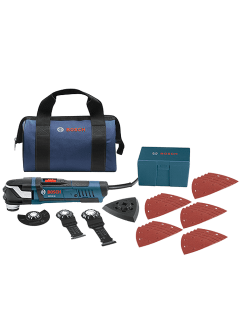 The Bosch GOP40-30B StarlockPlus Oscillating Multi-Tool Kit includes a tool that has the Starlock next-generation 3-D tool-accessory interface, which produces best-in-class accessory grip, making it the new professional standard in oscillating tool performance. With more contact surface area between the tool and accessory, the Starlock interface is a cupped 3-D tool-accessory connection that delivers greater torque transfer for an expanded work capacity. The no-touch blade-change system makes it easy to attach, remove or reposition blades. The professional-grade 4.0-amp motor delivers a top speed of up to 20,000 oscillations per minute, and the tool provides a 3.0 deg oscillating arc. A variable-speed dial allows the user to set the optimal speed for the task at hand, and Constant Response circuitry maintains the desired speed under load This robustly constructed tool has reinforced gearing for more durability, less vibration and optimal force transmission. At only 3.3 Lbs., this light and compact tool reaches tight spaces, provides comfortable ergonomic grip zones and has an LED light for illumination in dark work areas. It is ideal for flush cuts such as door-jamb cuts (using various plunge or segment blades). The GOP40-30 provides outstanding versatility " utilizing the many Starlock and StarlockPlus accessories to handle flush-cutting, plunge-cutting, sanding, grinding and many other tasks related to a wide array of materials. For compatibility with StarlockMax accessories, which perform industrial-grade applications, Bosch offers the GOP55-36 Oscillating Multi-Tool.