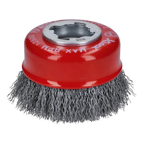 Bosch's X-LOCK Cup Brushes feature the X-LOCK mount that offers a change out that's up to five times faster than conventional interfaces. Theres an audible snap when mounting an X-LOCK wheel on an X-LOCK grinder. The wheel mounts properly without the need for a spanner wrench or flange nuts. The wheel is released from the grinder with the pull of a lever. Bosch Cup Brushes are ideal for removing weld scale, burrs, and corrosion. These crimped wire cup brushes are made with carbon steel bristles that provide a softer brushing action for confined spaces. The precision-balanced cup virtually eliminates vibration and they are made with high-quality materials. X-LOCK Cup Brushes are not backward compatible with standard 7/8 In. mounts.