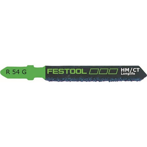 The R 54 G jigsaw blade is a blade is a special blade for cutting glass wall tile ceramics fiber-reinforced plastics cement board iron and steel. This blade doesn't have teeth but hard soldered carbide tipped splitters that cut through all tough materials you can think of. Thanks to its design this is the ideal blade for fine cuts in these though materials. Festool jigsaw blades are engineered for cutting efficiency long life and superior cutting results with a universal T-shank design that fits most professional jigsaws. Festool has the right blade for any application or type of material ensuring precise and consistent results. In order to select the right jigsaw blade for your application think first about the type of material you want to cut since there are blades available for wood plastics non-ferrous metals steel and special materials like fiberglass foam and other materials. Next decide what kind of cut you need: fine fast scroll clean. This will help to decide which blade is right for you. All Festool jigsaw blades are made in Germany from high-quality materials for the best possible cutting results. Includes 1 jigsaw blade.