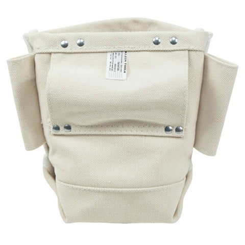 Klein's Bull-Pin and Bolt Bag holds two different bull pin sizes (1-Inch and 1-5/16-Inch). Made of sturdy No. 4 canvas and a double bottom, this bag features drain holes at the bottom to release any built-up water. Tunnel loops fit belt widths up to 3-Inch (76 mm).