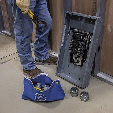 The Klein Tools Large Canvas Zipper bags are perfect for storing large hand tools and materials. This set includes three different colored bags (red, yellow, blue) for organizing by specific job tasks. The 3.5-Inch (89 mm) wide bottom allows for stability when standing and easy access when open. Constructed with tough No. 8 Canvas and heavy-duty brass zipper and grommet for added durability.