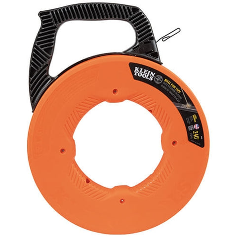The Klein Tools' 240-Foot High Carbon Steel Fish Tape is perfect for wire runs associated with commercial, residential and voice-data-video installations. The optimized housing and handle redesign decreases payout effort and reduces binding. A multiple-position handle allows for a firm, steady grip as you pull or rewind the tape. The unique interior case shape combines the leverage of square cases and the comfort of round cases, which makes rewinding tape after a long run easier. The tape features laser-etched descending markings placed at every foot. These markings allow you to accurately measure the depth of conduit runs and determine the amount of tape left to pay out.