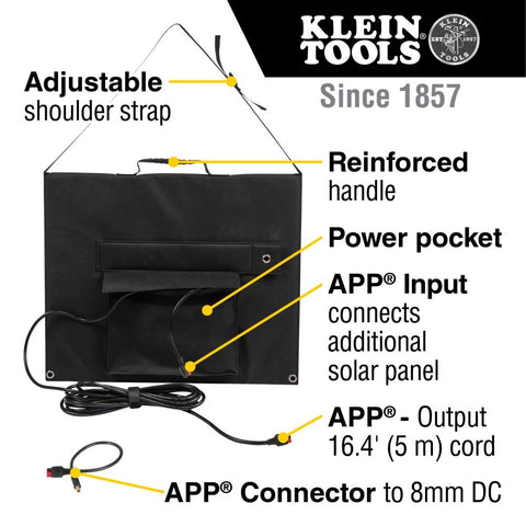 Klein's 60W Foldable Solar Panel harnesses the sun's power to keep the job running. A quick and easy way to charge your power banks, power stations, and portable batteries with the built-in extended length DC / APP compatible cables. Or simply recharge your USB devices with the integrated USB port. This portable and versatile panel can be chained with a second panel to collect even more power from the sun, then simply fold and store away.