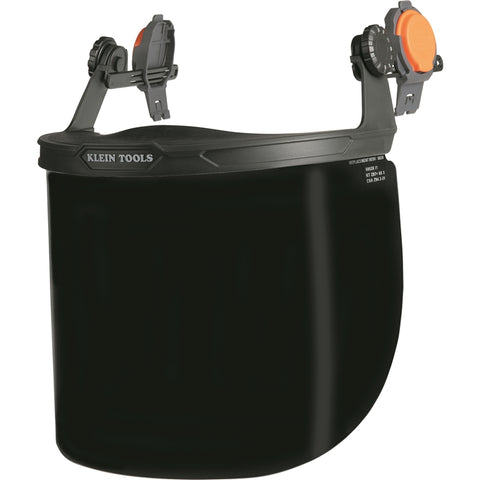 Klein Tools Face Shields offer a combination of safety, comfort, fit and convenience. High-impact tested with proper coverage to protect from small to large objects. Lightweight construction, low profile designs (clear, tinted and mesh models) specifically fit safety helmets, cap style and full brim hard hats. Secure attachment to universal mounts; adjustable modular design allows for use with hearing protection and headlamps. High-optical quality; anti-fog and scratch resistant coatings ensure enhanced visibility.