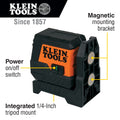 The Klein Tools Mini Cross Laser Level is a high-performance laser leveling and alignment tool for professionals with over 8 hours of runtime. This level provides a reliable pendulum self-leveling system with bright green laser level lines. Equipped with a magnetic mounting bracket and overmold design that protects from water and dust, Kleins Mini-Line Cross Laser Level enables a multitude of alignment and layout applications.