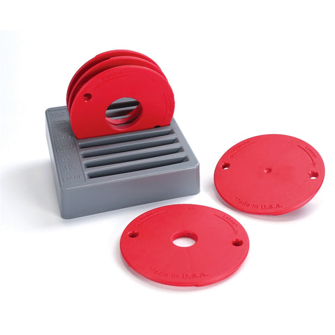 The set includes rings with 3/4", 1-3/8", 1-5/8", and 2-1/8" openings, plus one Blank ring that you can use to create your own custom-sized or zero-clearance ring. The set comes with a molded storage tray that has slots to hold all five Level-Loc Reducing Rings, plus slots to hold the three rings that come with the Precision Router Table Insert Plate or Precision Router Table Lift. Each slot is marked with the opening size, making it easy to keep the rings organized.