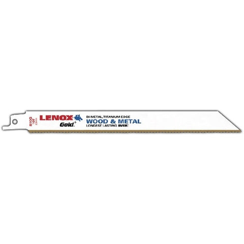 LENOX Gold 810GR - 8" 10TPI Titanium Edge Metal Cutting Reciprocating Blade - 5 Pack has specially formulated Titanium edge which improves the wear resistance of the teeth for faster cuts through the blade's life. The bi-metal technology flexes, resists breaking and also extends the life of the blade. The reinforced tooth design and Titanium coating combine to create the longest lasting blade, ever.