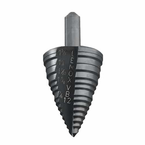 The LENOX 30912-VB12 Vari-Bit Step Drill Bit - 7/8", 1-1/8", 1-7/32", 1-1/4" & 1-3/8" has a patented two flute design which cuts fast, clean, round holes that are accurate and burr-free. The enhanced flute design also removes chips rapidly to ensure longer tool life. The split point on the tip of the Vari-Bit is designed for faster penetration and prevents walking. The steam oxide coating adds to the durability of the Vari-Bit Step Drill Bit.