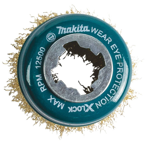 The 3"Brass-Coated Carbon Steel Crimped Wire Cup Brush offers continuous brushing action for removing rust, scale, and weld splatter. It is ideal for edges, paint-scale and light rust removal on flat or irregular surfaces. The brass-coated carbon steel wire is resistant to rust for increased durability over standard carbon steel wire. The X-LOCK quick change system provides up to 5x faster cup brush changes vs. a standard angle grinder mount. Simply pull the release lever on the X-LOCK Angle Grinder and change the wire cup brush1/2 no tools needed. For use with Makita X-LOCK Angle Grinder models XAG25, XAG26 and GA4570 (sold separately).