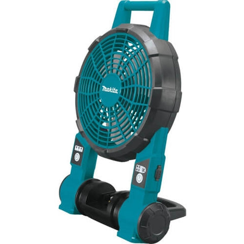 The Makita 18V LXT Lithium-Ion cordless fan (model DCF201Z) is a powerful and portable solution for painters, contractors, and more. The DCF201Z has two settings for optimal air velocity control. It can be powered by Makita 18V Lithium-Ion batteries, or an AC adapter. The durable design and protective bumpers are engineered to withstand a job site environment. Its part of Makita's expanding 18V Lithium-Ion system, the worlds largest cordless tool system powered by 18V Lithium-Ion slide-style batteries. Makita 18V Lithium-Ion batteries have the fastest charge times in their categories, so they spend more time working and less time sitting on the charger. For improved tool performance and extended battery life, Makita created Star Protection Computer Controls. STAR Protection is communication technology that allows the star Protection-equipped tool and battery to exchange data in real time and monitor conditions during use to protect against overloading, over-discharging and overheating. For increased versatility, the tool can also be powered by Makita 18V LXT and compact Lithium-Ion batteries with the star symbol on the battery indicating STAR Protection inside.