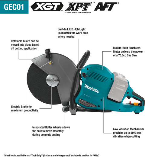 The GEC01 is engineered with Active Feedback-Sensing Technology (AFT), which electronically turns off the motor if the rotation of the cutting wheel is suddenly forced to stop. It also features Extreme Protection Technology (XPT), which is engineered for improved dust and water resistance for operation in harsh conditions.