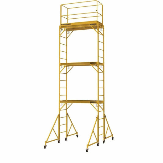 - Includes: 3 ft. to 6 ft. scaffolding frames, 3 plywood platforms, 12 caster wheels, 1 guardrail set, 1 set of 4 outriggers