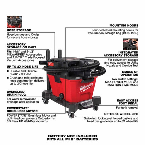 Our M18 FUEL 6 Gallon Wet/Dry Vacuum brings unmatched performance, durability, and versatility to jobsite cleanup. The POWERSTATE Brushless Motor and optimized components Outperform 3.5 Peak HP Wet/Dry Vacuums, delivering more cleaning power than corded. The wet/dry vac cleans up more common jobsite debris like drywall dust, concrete dust, and wood/metal shavings than 3.5 peak HP wet/dry vacuums in the same amount of time. This wet/dry vacuum provides you with the Most Durable Wheels and Hoses with reinforced casters and tread design for up to 8X wheel life. The crush and twist-resistant hose construction delivers up to 2X hose life. This vac is part of the Most Versatile Wet/Dry Vacuum System with interchangeable motor heads, tanks, and carts for varying performance, holding capacity, and mobility with the easy access foot pedal. MAX POWER MODE delivers up to 31 minutes of continuous cleaning time (up to 1,000 ft²) per charge on an M18 REDLITHIUM HIGH OUTPUT HD12.0 Battery Pack. MAX RUN-TIME MODE delivers up to 47 minutes of continuous cleaning time (up to 1,300 ft²) per charge on an HD12.0 Battery Pack. The included Large High-Efficiency Filter ensures optimal dust and microparticle collection. You can use MILWAUKEE Fleece Dust Bags for less debris build-up on the filter. Integrated accessory storage allows for easy access to the crevice tool and utility nozzle on the motorhead, with more accessory storage spots on the removable wet/dry vacuum cart.