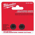 The Milwaukee 2 pc. Replacement cutter wheels are designed for use with Milwaukee close quarters tubing cutters. Milwaukee replacement blades are constructed with high carbon steel for long life. Precision grinding delivers a sharp cutting edge. Optimized for cutting copper tubing.