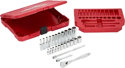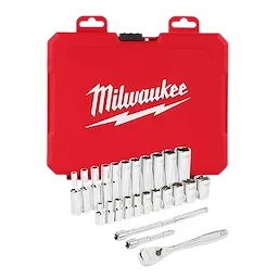 The Milwaukee 1/4 in. 26 piece drive ratchet & socket sets provides better access and maximum strength. The 90-tooth ratchet offers 4 deg of arc swing and a slim profile design, allowing work in tighter spaces. The wrench-compatible socket design has four parallel flats to deter rolling. Optimized socket geometry reduces rounding and stripping. SAE socket sizes are stamped into the flats for improved visibility. The kit comes with a removable inner tray and a portable carrying case. The set comes with accessories included.