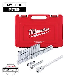 The Milwaukee metric 28 piece 1/2 in. drive ratchet & socket set was designed from the ground up to offer better access in tight spaces and maximum tool strength. The 90-tooth ratchet tool offers 4 of arc swing and a slim profile design, allowing work in tighter spaces. Innovative socket design has four parallel flats, which deter rolling and are wrench-compatible. Optimized socket geometry helps reduce bolt rounding and stripping. Socket sizes are stamped into the flats for improved easy-to-read visibility. the ratchet and socket kit comes with a removable inner tray, designed to be stored long-term in a steel storage chest. It also comes with a durable carrying case for ultimate portability. The set comes with accessories included so that our users can get every job done, both in the garage and on the jobsite. The ratchet and socket set is backed by a mechanics hand tools lifetime guarantee.