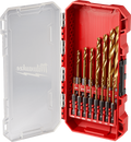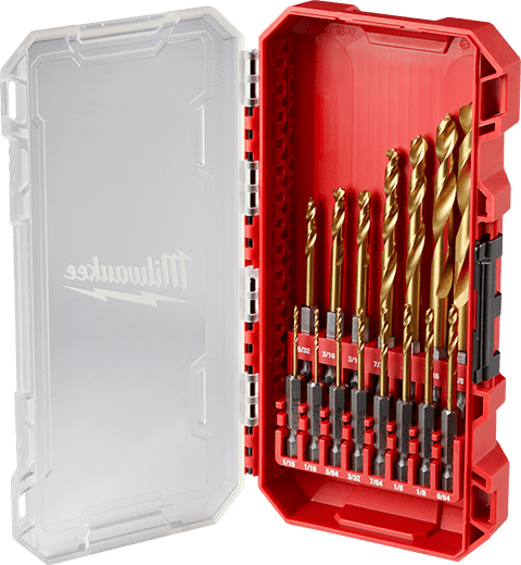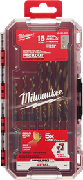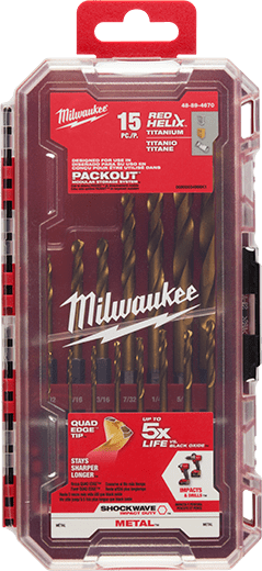The MILWAUKEE SHOCKWAVE Impact Duty 15PC RED HELIX Titanium Drill Bit Set is engineered for extreme durability and long life. The QUAD EDGE tip delivers a precision start and features four cutting edges to create smaller chips for faster material removal and less heat leading to improved performance. Designed with a VARIABLE HELIX flute that begins with an aggressive 35 helical angle and ends at 15 for rapid chip removal. The bits also feature an internal thicker tapered web that greatly increases strength, reducing premature breakage. Ideal for various applications including but not limited to wood, plastics, and metals. MILWAUKEE RED HELIX Titanium Drill Bits provide up to 5X life vs. black oxide drill bits. Set is organized in a customizable accessory case designed for use in PACKOUT.