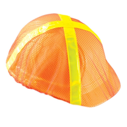High visibility mesh hard hat covers with reflective striping add conspicuity to any hard hat.