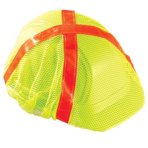 High visibility mesh hard hat covers with reflective striping add conspicuity to any hard hat.
