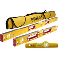 STABILAs type 196 classic level sets are bestselling level sets that include 2 foot type 196 levels, 4 foot type 196 levels, 10 inch torpedo levels, and protective level bags for storage and carrying. STABILAs type 196 spirit levels feature extra-rigid rectangular box beam aluminum profiles with reinforcing ribs, milled measuring surfaces, ergonomic handles, removable shock-absorbing end caps with anti-slip wall grips, and very accurate matched vials that ensure both plumb readings are the same when leveling in normal and reverse positions. These hand tools are the most popular STABILA box frame spirit level tools in North America! STABILAs type 81 SM torpedo levels feature I beam die cast frames, milled measuring surfaces, rare earth magnets, hang holes, and very accurate plumb and level vials. These unique die cast aluminum frames are some of the sturdiest and most recognizable spirit levels on the market. STABILAs type 81 SM torpedo level tools can easily be used for many different leveling applications and are very popular in North America. Level sets are cost effective alternatives for those seeking to acquire multiple STABILA levels.