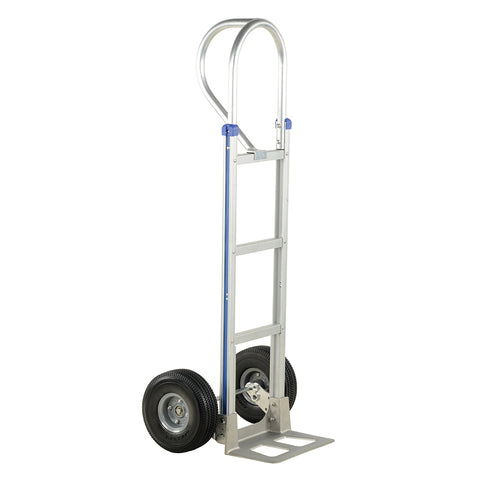 This lightweight aluminum hand truck features an integral work bench. Work bench conveniently folds flat for storage. Now a sturdy work bench can be moved to where it is needed most. Provides for a more comfortable and ergonomically correct work position. P-handle design allows for easy maneuverability.